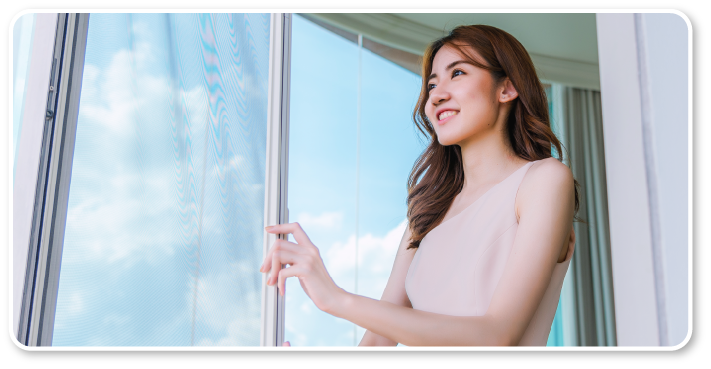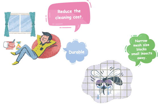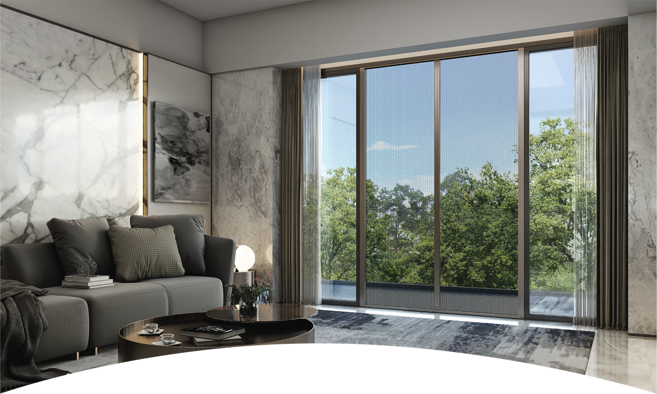 when it is not used, the net can be rolled up and kept in a box and allow people to fully enjoy the view without obstacles. The net panels are installed and subtly attached to the windowsills and doorsills with the size of 54 mm. wide.