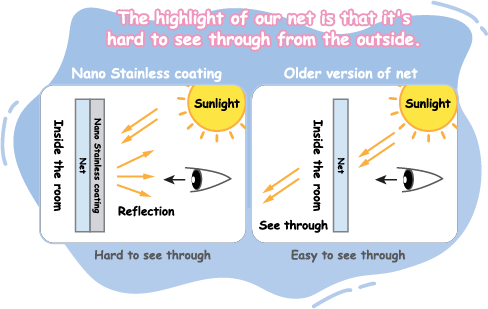 • Made of polyester. The outer side of the net, covered by silver-color-stainless, makes it hard for people from the outside to see through.