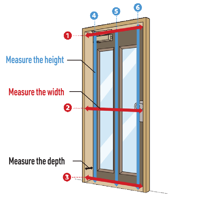 It is important to take precautions when measuring the size of the door before installation, In some cases the door’s frame may be curved and not even; therefore, the width, length and depth should be measured at least 3 levels as seen in the picture.