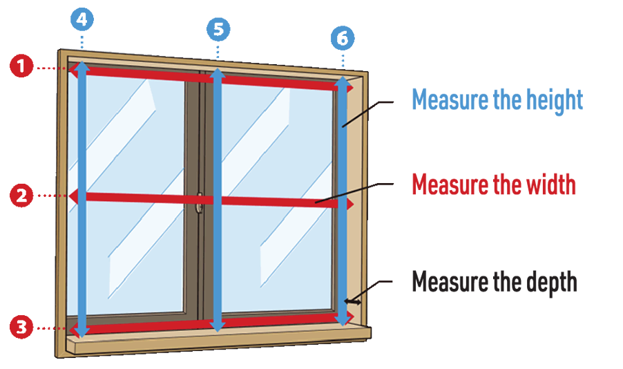 It is important to take precautions regarding measuring the size of the window before installation. In some cases the window's frame may be curved and not even; therefore, the width, length and depth should be measured at least 3 levels as seen in the picture.